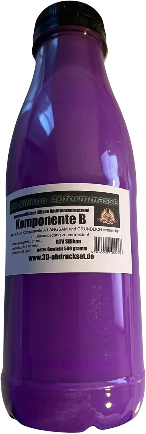 A silicone that allows mixing without a vacuum pump, as it is self-venting when hardening. You can determine the colour yourself. This set is available in purple, the silicone is in Shore hardness 30 ShA°, the remarkable precision in reproduction, a high dimensional stability and high mechanical resistance makes the silicone a quality hit among silicones. It is particularly suitable for making models: masks, replica of body parts, internal organs, epitheses, silicone dolls of any kind, products. from the erotic area.