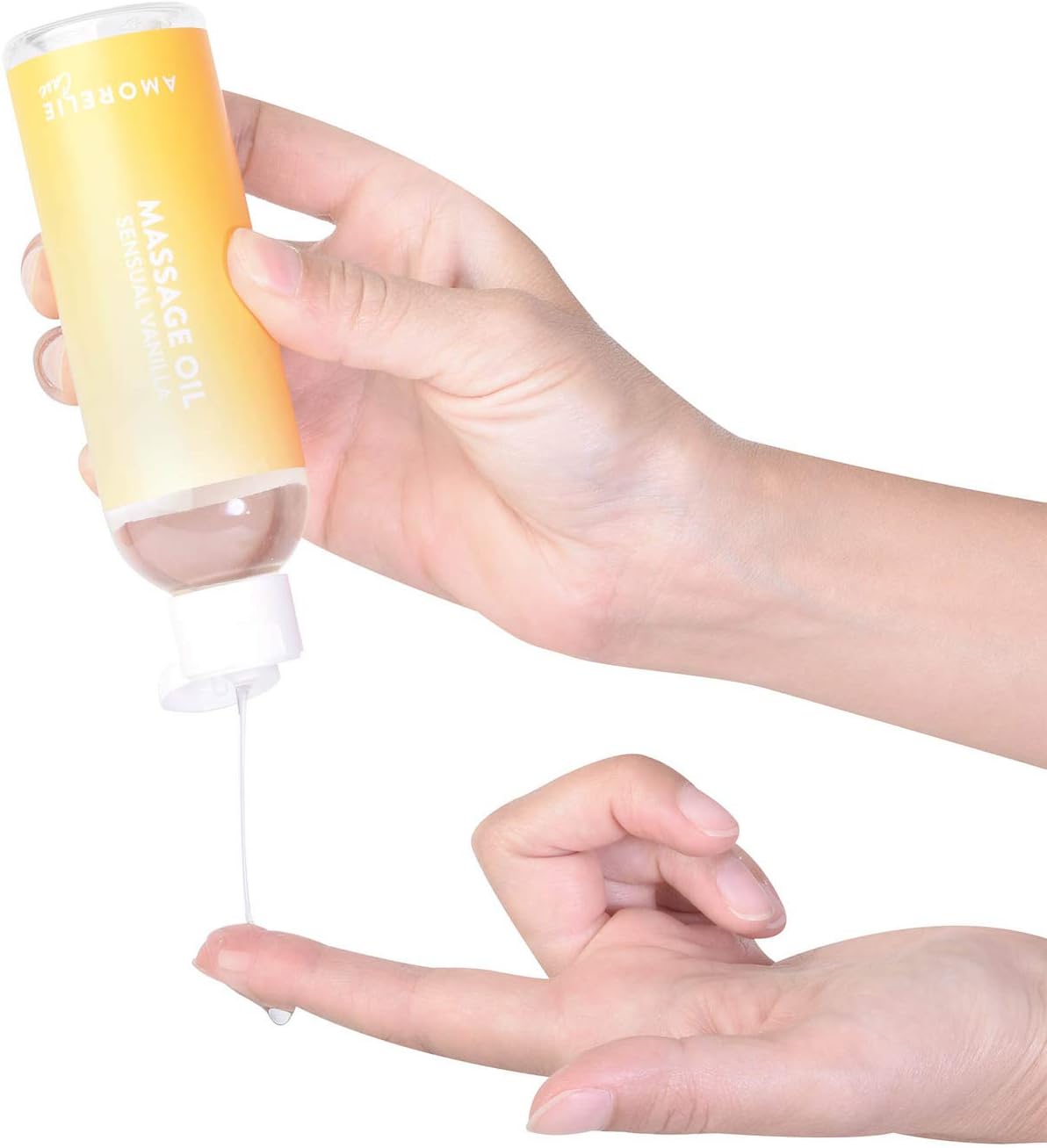Amorelie Care massage oil held in the hand.Amorelie Care massage oil held in the hand.