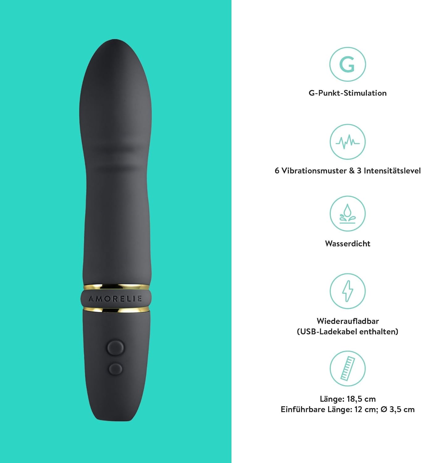 DETAILS: Length: 18.5 cm, Insertable length: 12 cm, Durchmesser: 3.5 cm, Ring made of real gold finish, rechargeable, USB charging cable included, waterproof, high quality packaging, discreet design