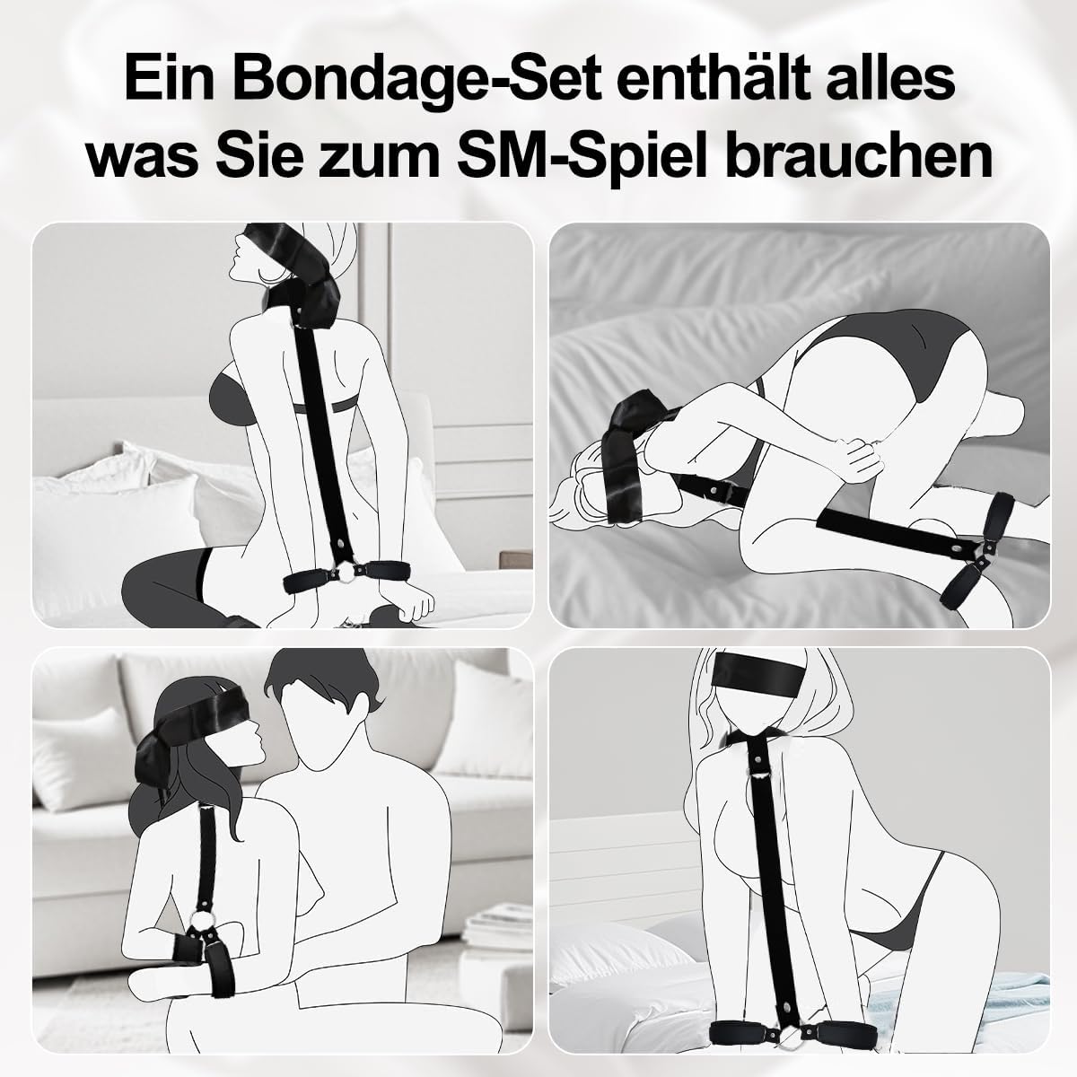 SPICE UP YOUR LOVE LIFE This sex toy bondage set is suitable for both men and women. Start blindfolded role-playing and complement your foreplay and flirting, submission and restraint in the bedroom with our sex toys for couples. Tease and torment you or your partner in a pleasant way, make your lover scream and enjoy it