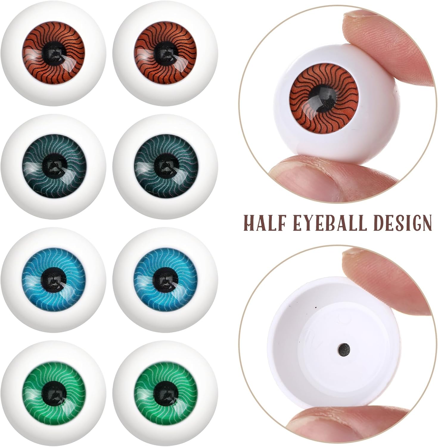 Each pack contains 8 eyeballs in different colours – brown, blue, green and grey. Use this variety to create your own unique Halloween props. The eyeballs are half round, with a flat back and hollow, which gives them a realistic look. They are ideal for DIY projects and creative decorations.