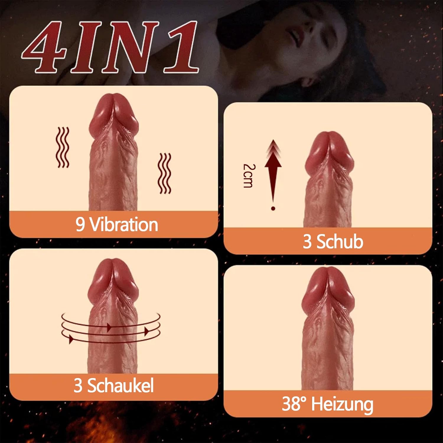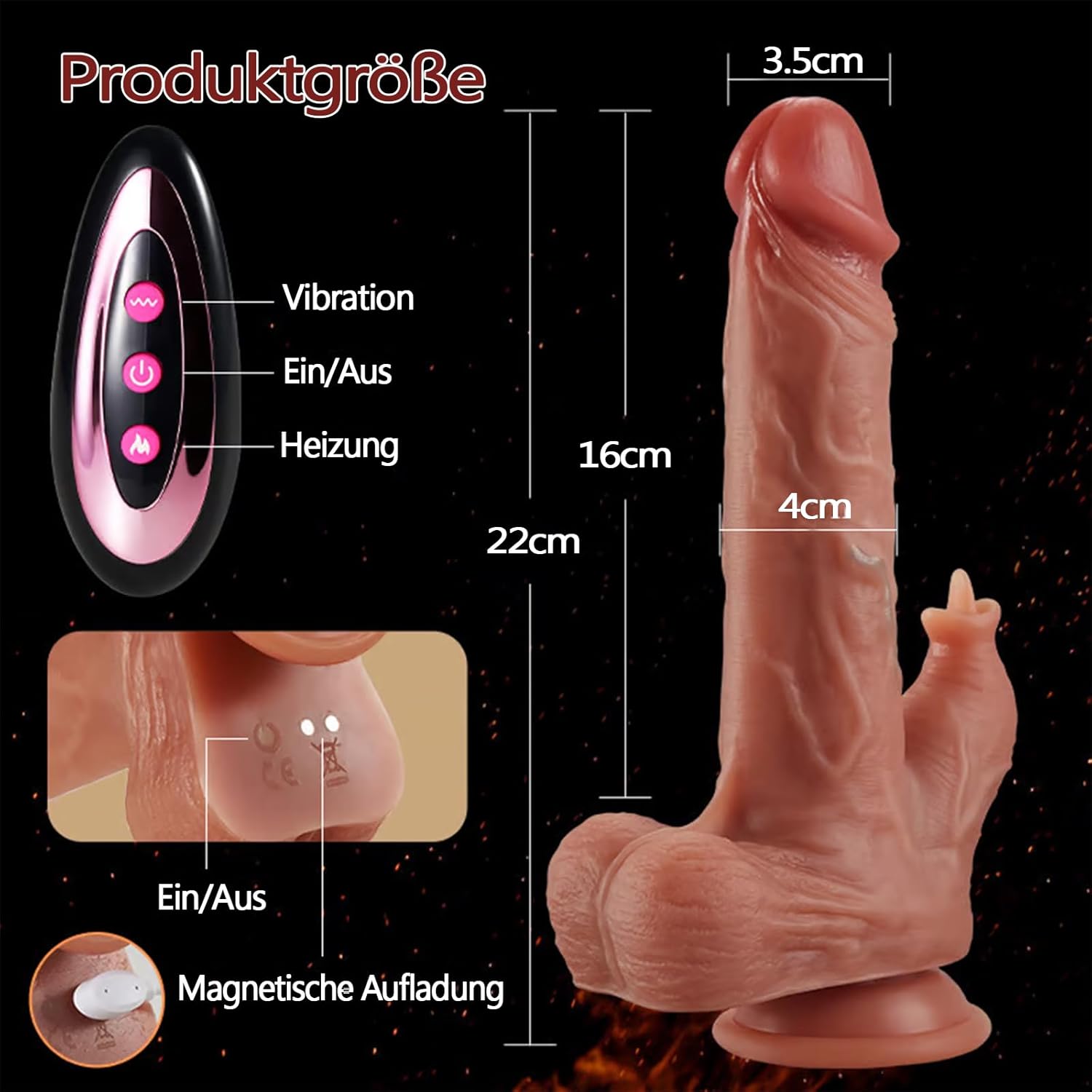 Strong suction cup and 42°Kohlenstoff heating: the bottom of the dildo vibrators is a very strong suction cup, the dildo vibrator can be attached to any smooth, dry surface. When you activate the vibrator, the vibrator heats up and you soon feel how the actual body temperature of 42° burns in your body. You can free your hands almost anywhere and enjoy the happiness of the vibrator.
