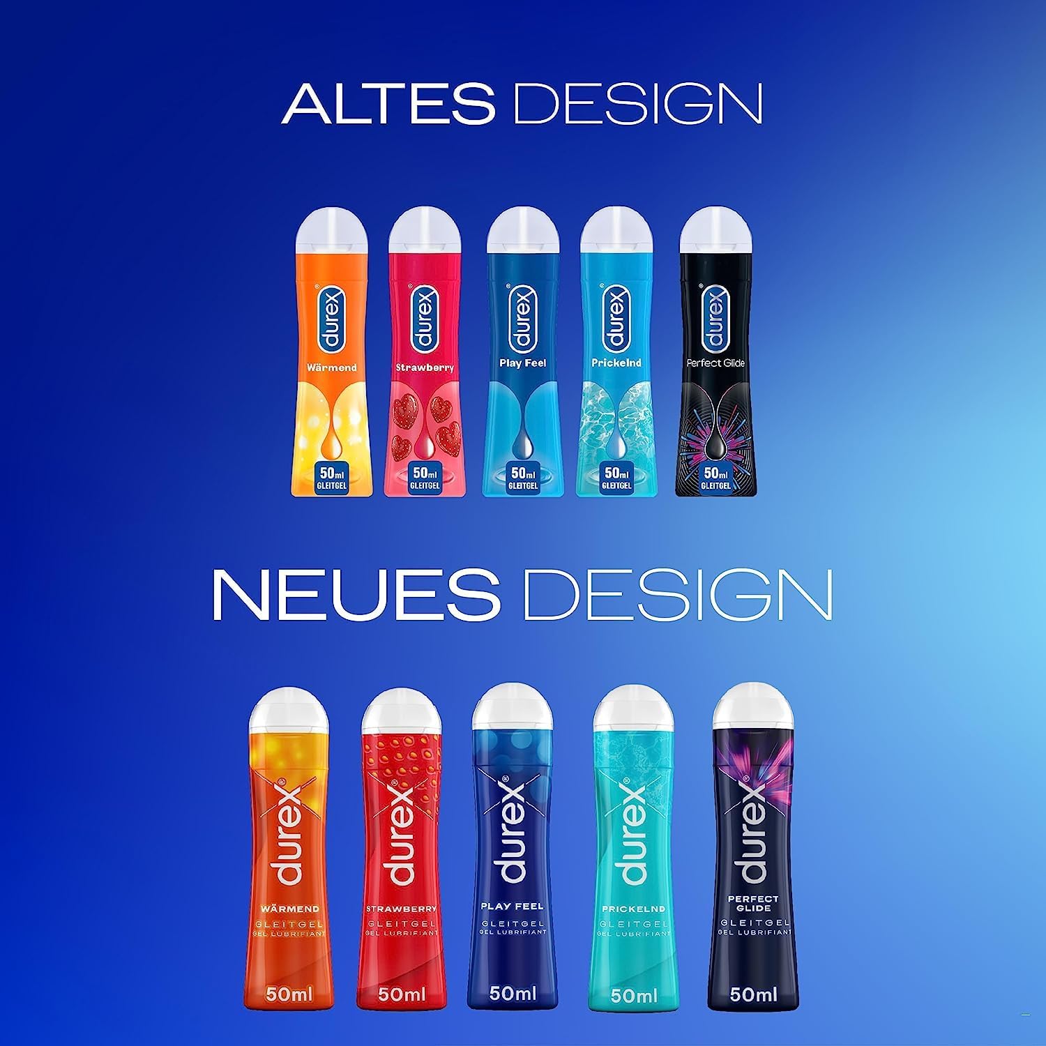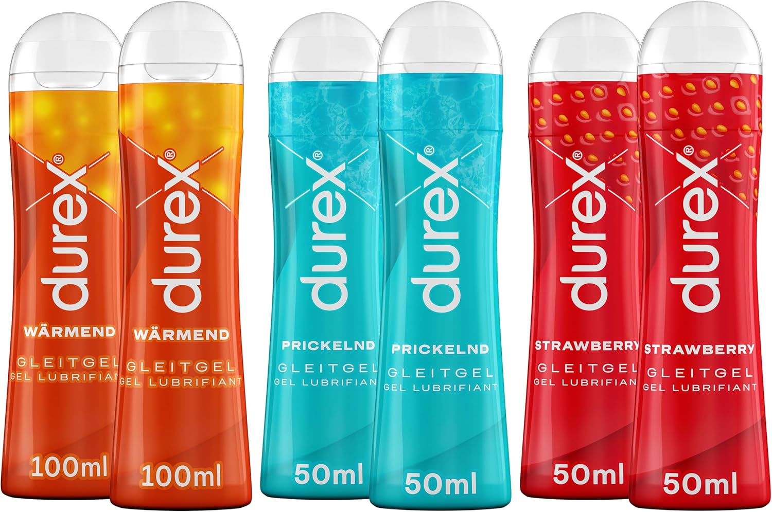 Schachtel contents: 2 x 50 ml „warming“ experience gel from Durex, 2 x 50 ml „tingling“ experience gel from Durex, 2 x 50 ml „strawberry“ experience gel from Durex