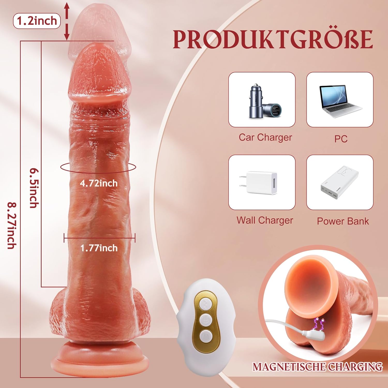 Magnetisch aufladbarer realistischer Godemiché: Welcher Ladeanschluss dieses realistischen Dildos ist magnetisch geladen, er ist einfacher zu dienen und wasserdichter wie herkömmliche DC-Port-Ladegeräte. Er muss beim Laden aufwärts einem glatten Tisch platziert werden, um schlechte Ladekontakte zu vermeiden.