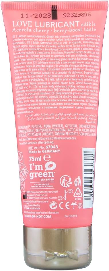 This water-based lubricant has a sensual, strong acerola cherry flavour. The gel is edible and can be used in combination with sex toys and condoms. Ingredients: Wasser (WATER), Glycerin, Chondrus Crispus (Carrageenan), Dehydroxanthan Gum, Lactic LSD, aromatischer Geschmackstoff (Flavor), Glucose, Potassium Sorbate, Sodium Benzoate, Sodium Süßstoff