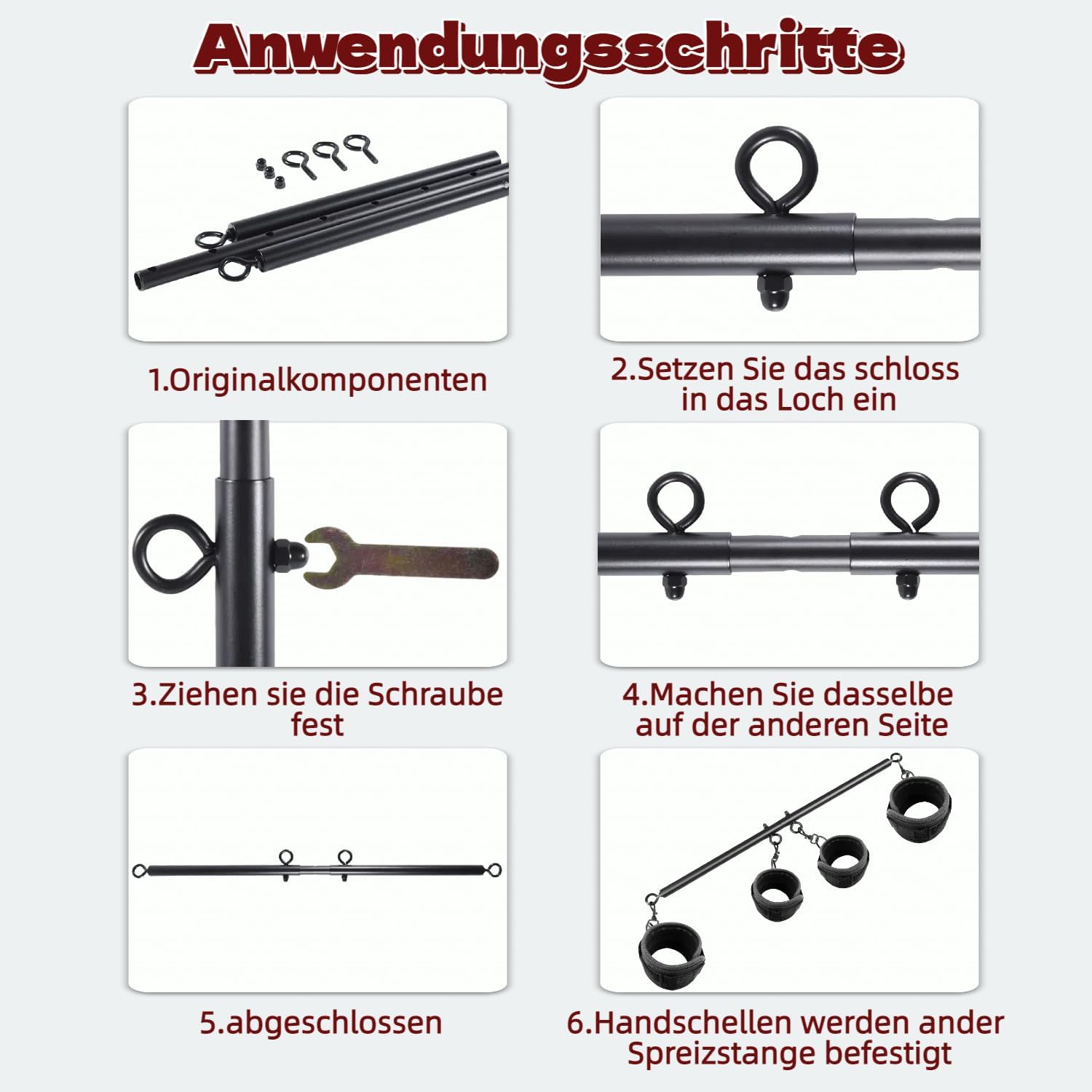 This sex suit has 2 spreader bars and 2 handcuffs and 2 ankle restraints and 1 neck restraints. You can adjust the bondage Kneipe between 22 and 36 inches for soft bondage and light bondage games.