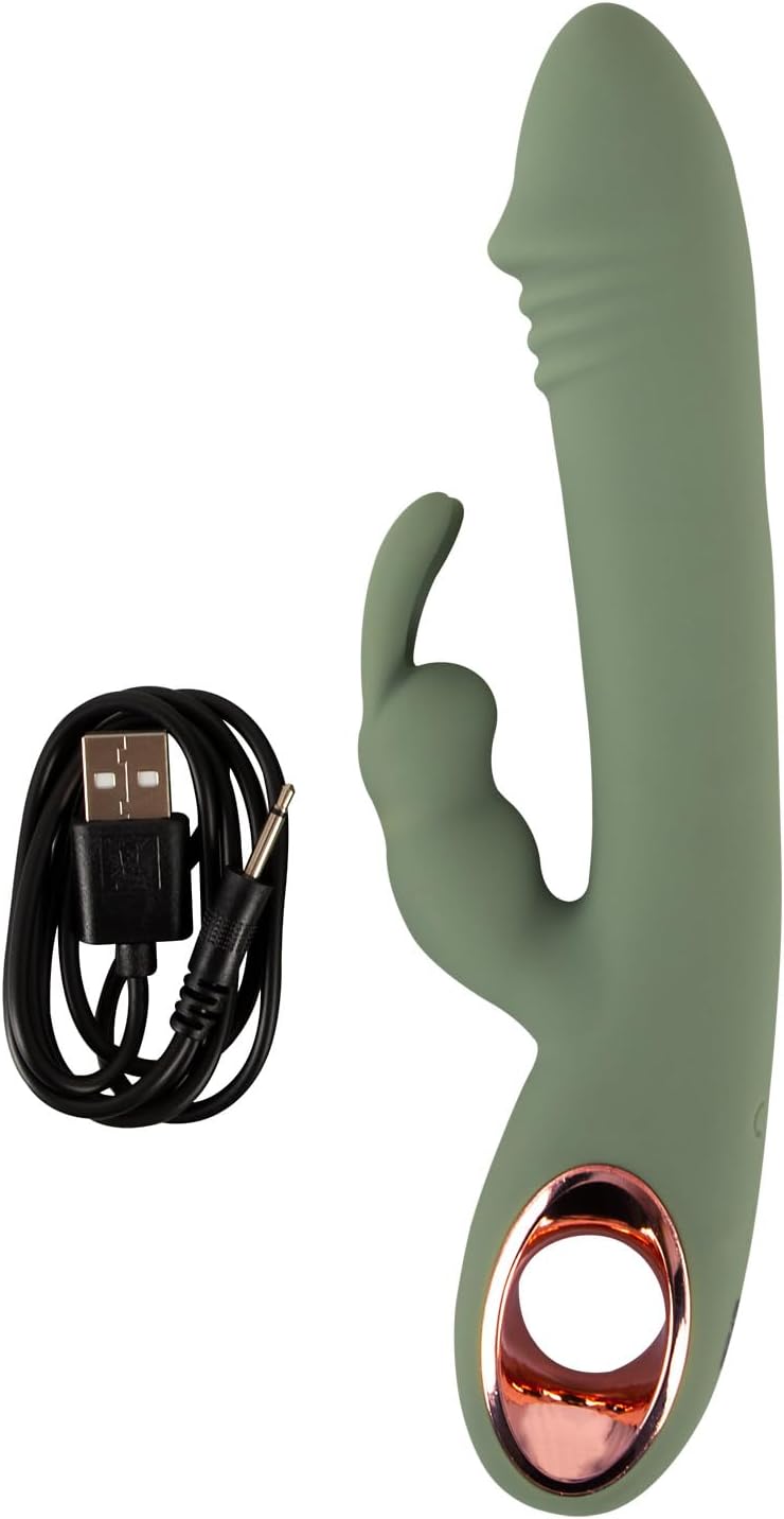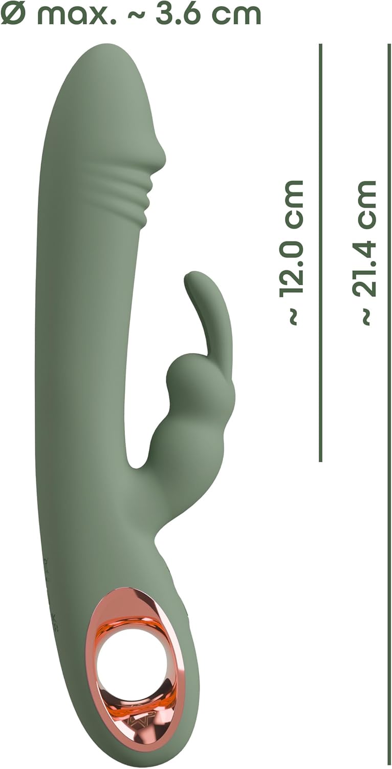Synchronous hotspot massages with pampering comfort! Elegant handy dual vibrator Slim Rabbit Olive from You2Toys for double action: vagina and clitoris are pampered at the same time! 2 powerful, quiet motors provide reliable power for 10 vibration modes in the shaft and in the clitoral bunny. The practical ring handle allows individual vibrations to be controlled separately from each other. Even in the bath and shower, because the rabbit vibrator is waterproof. Made from silky soft silicone, the ergonomically perfectly shaped rabbit vibrator can be easily inserted and played. Flexible all around, it adapts perfectly to the body and movements during play. The sensitive shaft pampers with stylised textured glans pleasantly filling vaginal and G-spot. The ideally curved clitoral bunny flatters the outer hotspot with its soft ears. Double stimulation, double enjoyment, double comfort! Rechargeable – Includes USB charging cable. Total length 21.4 cm, insertion length 12.5 cm, diameter max. 3.6 cm. Weight 165 g. Silicone, Antiblockiersystem.